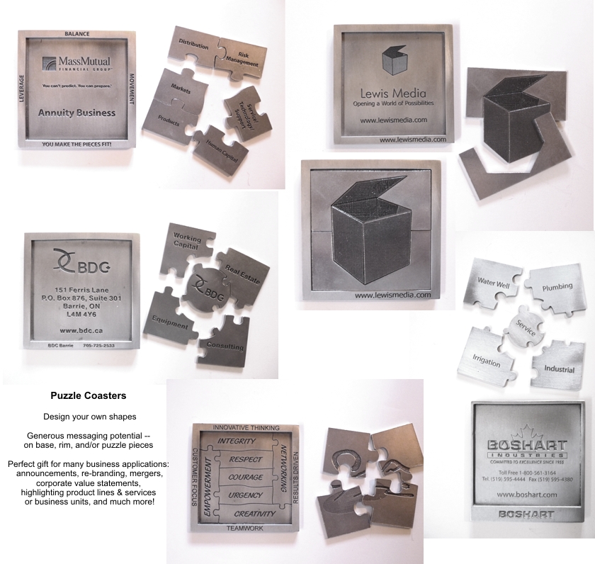 Custom pewter puzzle coaster in your choice of 3, 4 or 6 puzzle pieces. Choose between having your artwork lasered on a stock round shape or cast/debossed in your own custom shape. Individually boxed.