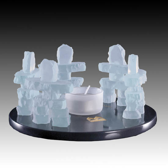 Synonymous with friendship, caring, sharing, and good fortune. It is said that friends would gather around a bonfire reminiscing about good times shared together. As the embers of the fire faded, their friendship was reinforced, bringing them good luck and a renewed closeness. This circle of five frosted glass Inukshuks on a base is presented in 2-piece black gift box with satin lining and romance card. Customize the message on the back of the romance card at a small added charge. Available with or without the candle holder.