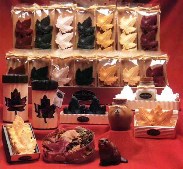 The maple leaf shaped soaps are attractively packaged individually or in sets of three or more. They come in five colours: ivory, hunter green, burgundy, butter cream and gold.
