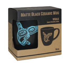 Stunning imagery by Native artists of Canada's Northwest Coast silkscreened on 14oz black ceramic mugs with matte exterior and gloss interior. Microwave safe. Individually boxed. Designs include: Pacific Spirit, Running Raven, Salmon, The Offering, Thunderbird, Swallow, and Whale.